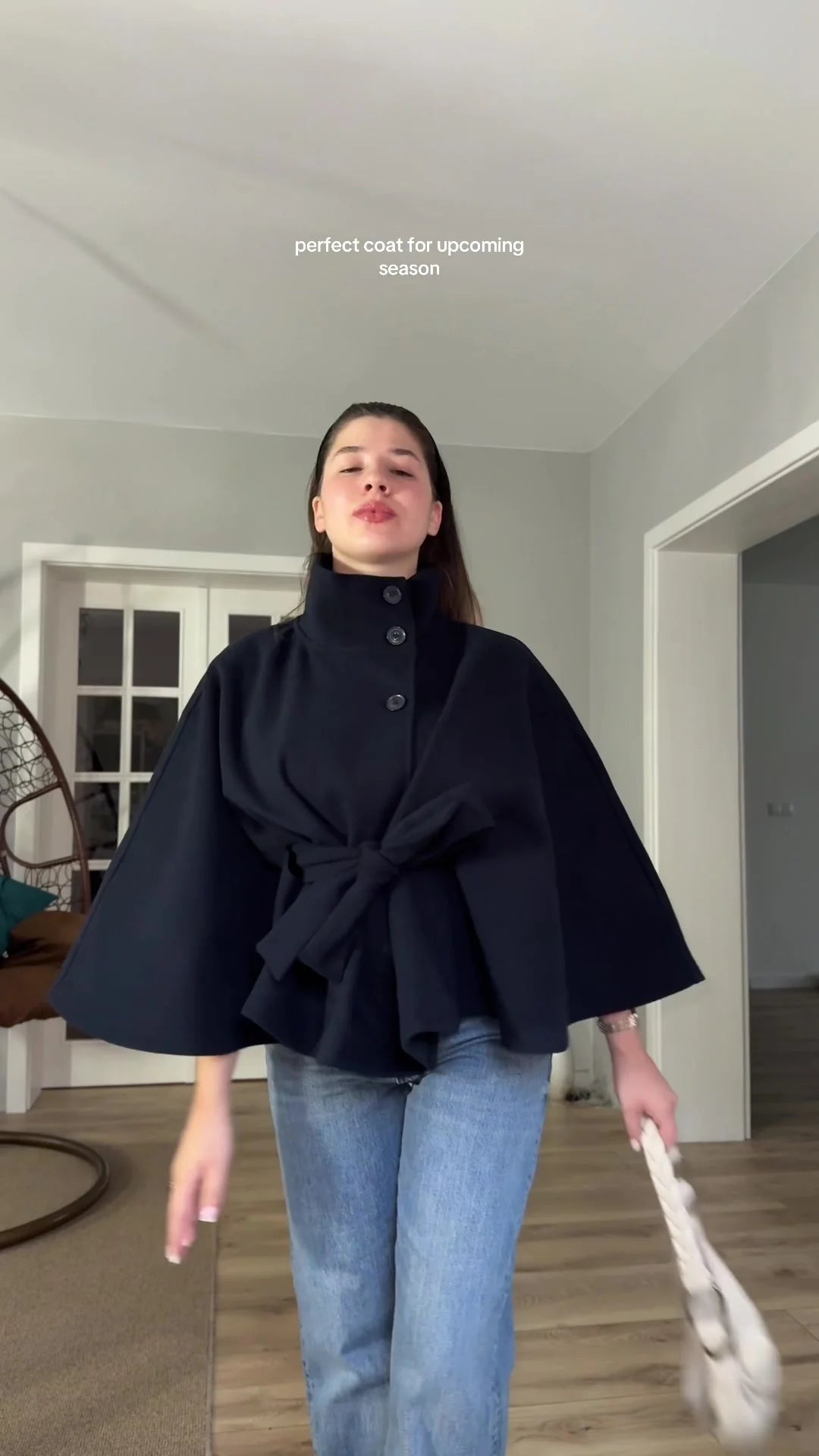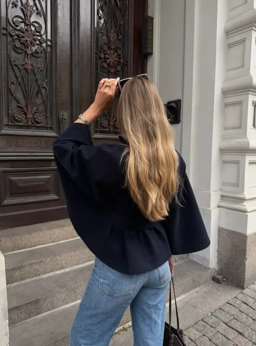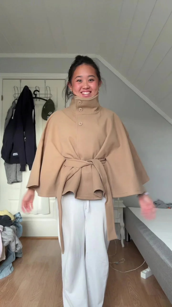 The Vittoria Jacket is a chic statement piece — designed with a structured stand collar, belted waist, and a flowing cape silhouette that elevates any outfit. Its refined drape adds effortless polish, while the versatile design makes it the perfect layering piece for autumn and winter.